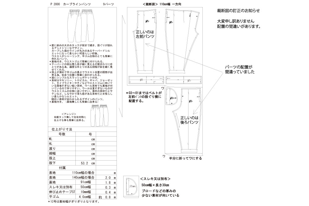 P2000カーブラインパンツの仕様書の裁断図に間違いがありました。パーツの配置に間違いがありました。