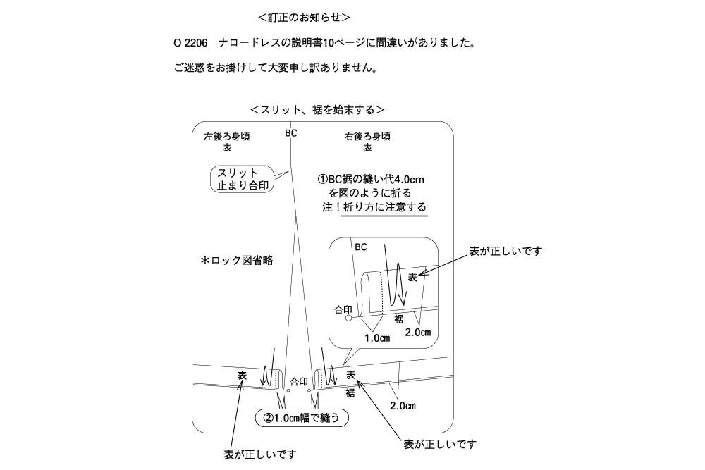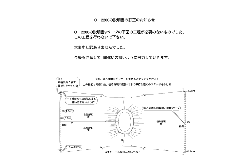 O2200ネックギャザードレスの説明書9ページに間違いがありました。