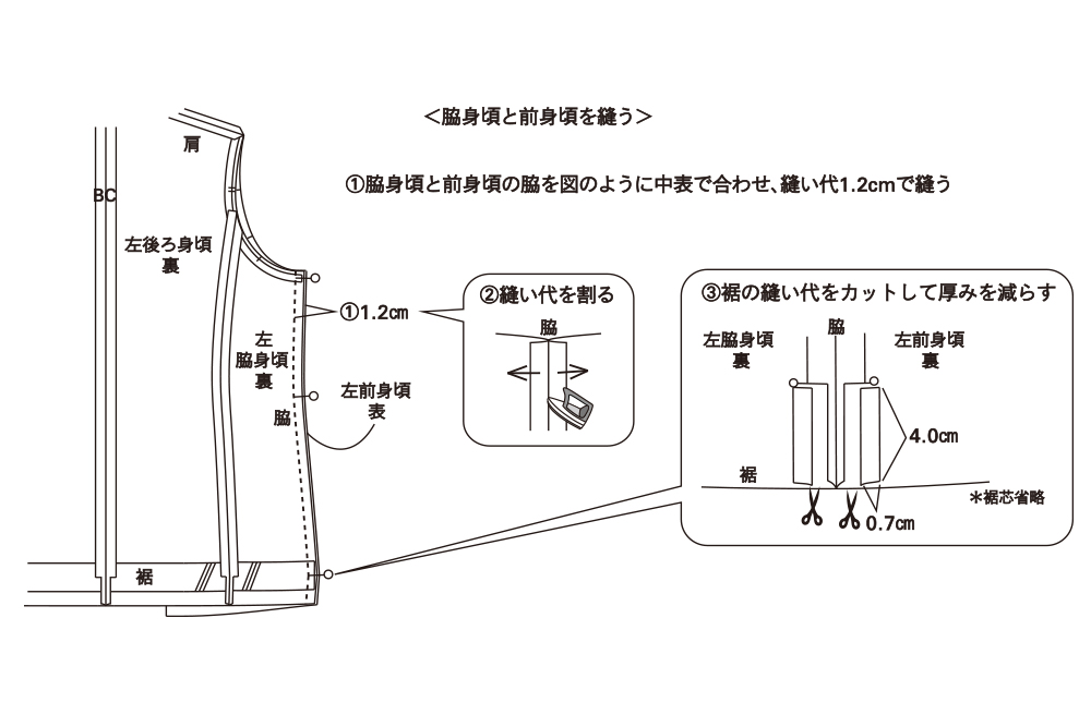12ページの図で縫い代が後ろに倒されていますが、正しくは割りです。13ページでは、縫い代を割る図がありませんでした。