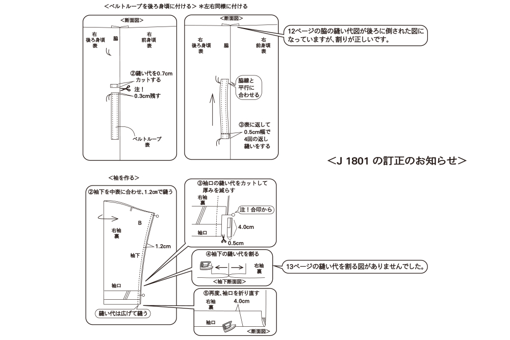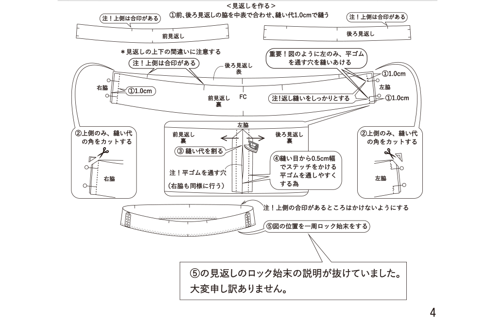4ページ右下の「拡大図」の「⑦縫い目から後ろ身頃側に倒す」という説明ですが、正しくは「⑦縫い目から前見頃側に倒す」でした。同時に吹き出し内のイラストも間違っておりました。