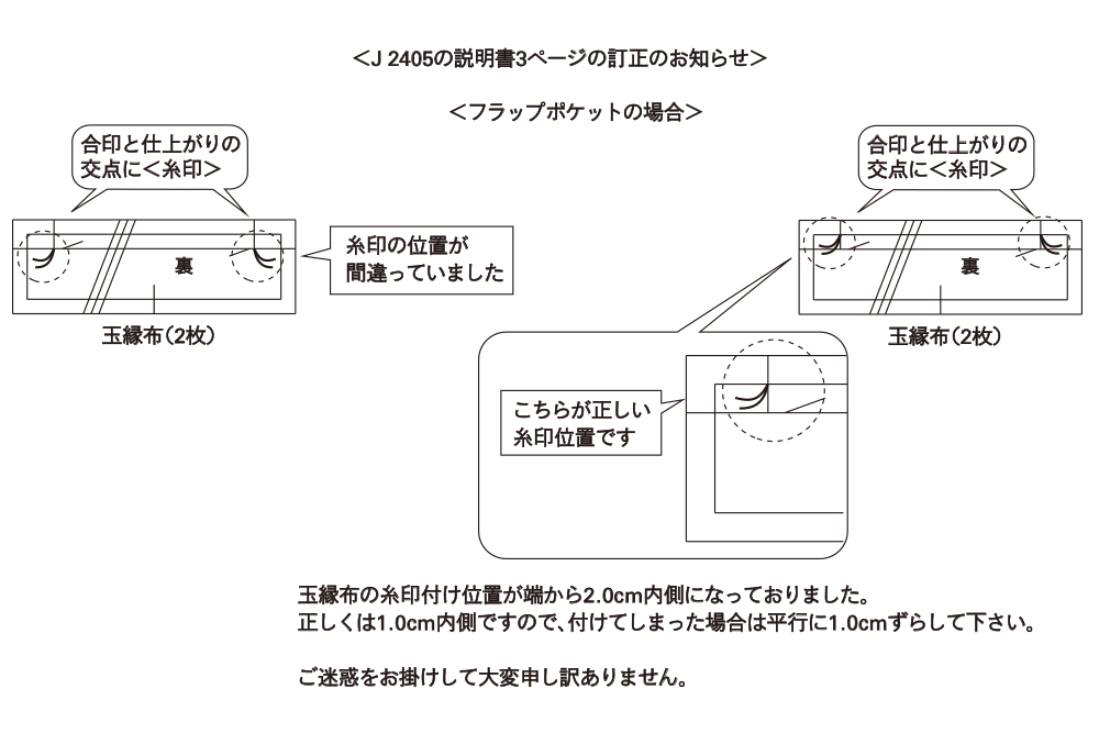 J2405セミオーバーサイズジャケットの説明書3ページに間違いがありました。糸印の位置が間違っておりました。