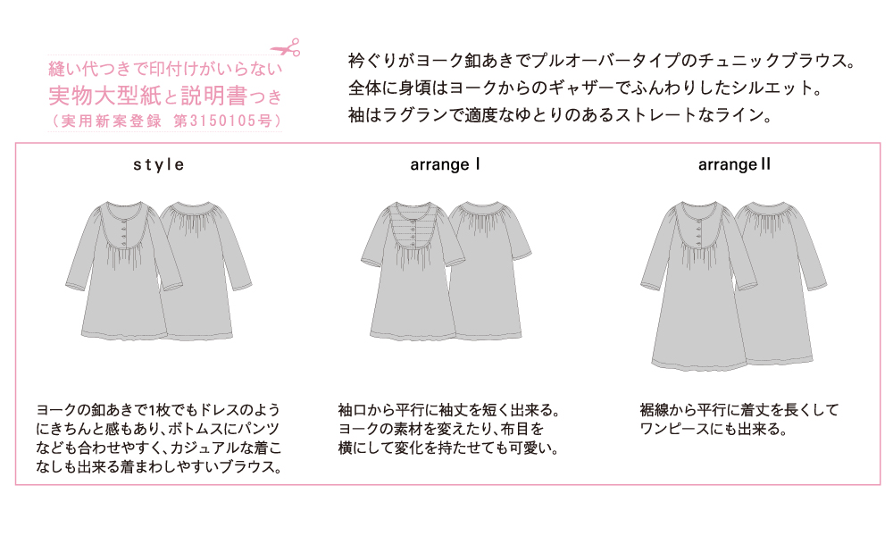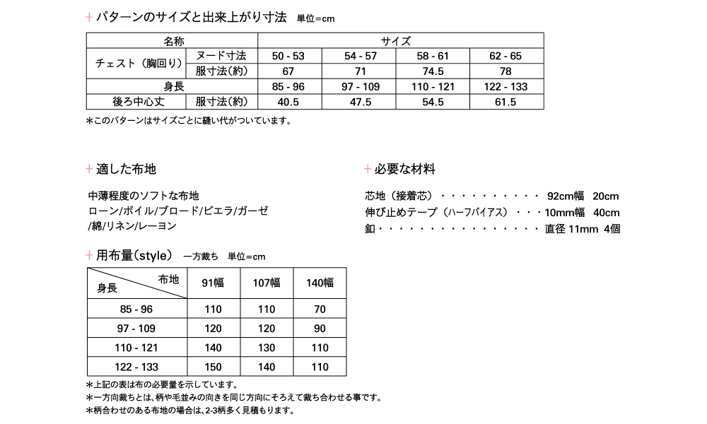 ●この商品は、ネット販売しておりますパターンと違い、1~3枚の紙に複数のサイズが印刷された実物大のパターンです。お客様ご自身でサイズを決定して頂き、、パターンをカットしてご使用下さい。