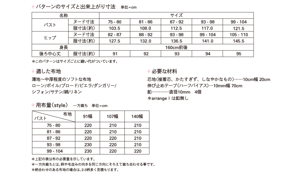 ●この商品は、ネット販売しておりますパターンと違い、1~3枚の紙に複数のサイズが印刷された実物大のパターンです。お客様ご自身でサイズを決定して頂き、、パターンをカットしてご使用下さい。