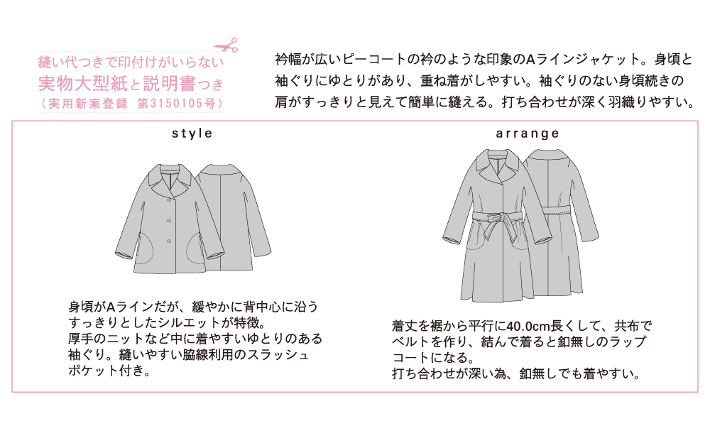 ●このパターンは、Mパターン研究所が企画・制作したパターンを、ジャノメミシン子会社「サン・プランニング社」が印刷・発行し、全国約700店の手芸専門店にて販売しております。Mパターン研究所がネット販売しておりません。お近くの手芸店でお買い求め下さい。