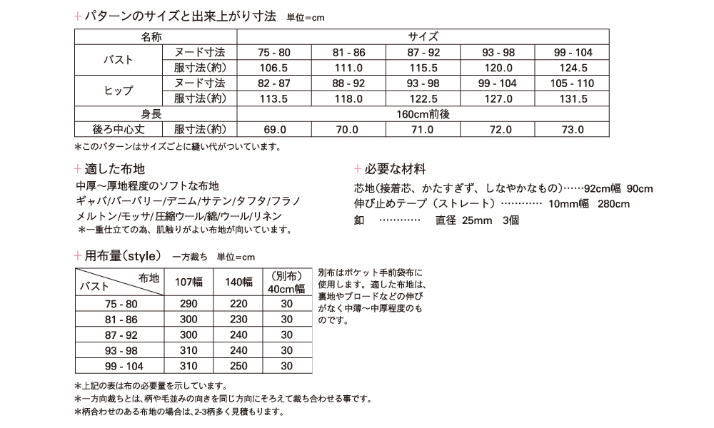 ●この商品は、ネット販売しておりますパターンと違い、1~3枚の紙に複数のサイズが印刷された実物大のパターンです。お客様ご自身でサイズを決定して頂き、、パターンをカットしてご使用下さい。