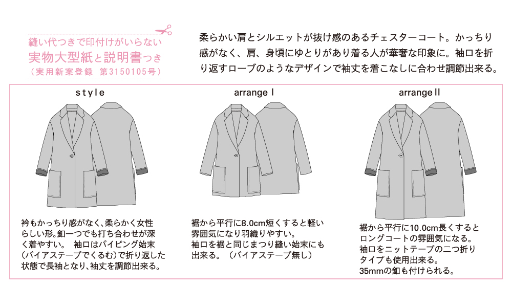 ●このパターンは、Mパターン研究所が企画・制作したパターンを、ジャノメミシン子会社「サン・プランニング社」が印刷・発行し、全国約700店の手芸専門店にて販売しております。Mパターン研究所がネット販売しておりません。お近くの手芸店でお買い求め下さい。