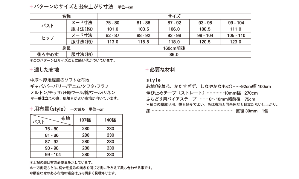 ●この商品は、ネット販売しておりますパターンと違い、1~3枚の紙に複数のサイズが印刷された実物大のパターンです。お客様ご自身でサイズを決定して頂き、、パターンをカットしてご使用下さい。