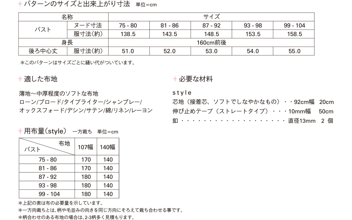 ●この商品は、ネット販売しておりますパターンと違い、1~3枚の紙に複数のサイズが印刷された実物大のパターンです。お客様ご自身でサイズを決定して頂き、、パターンをカットしてご使用下さい。