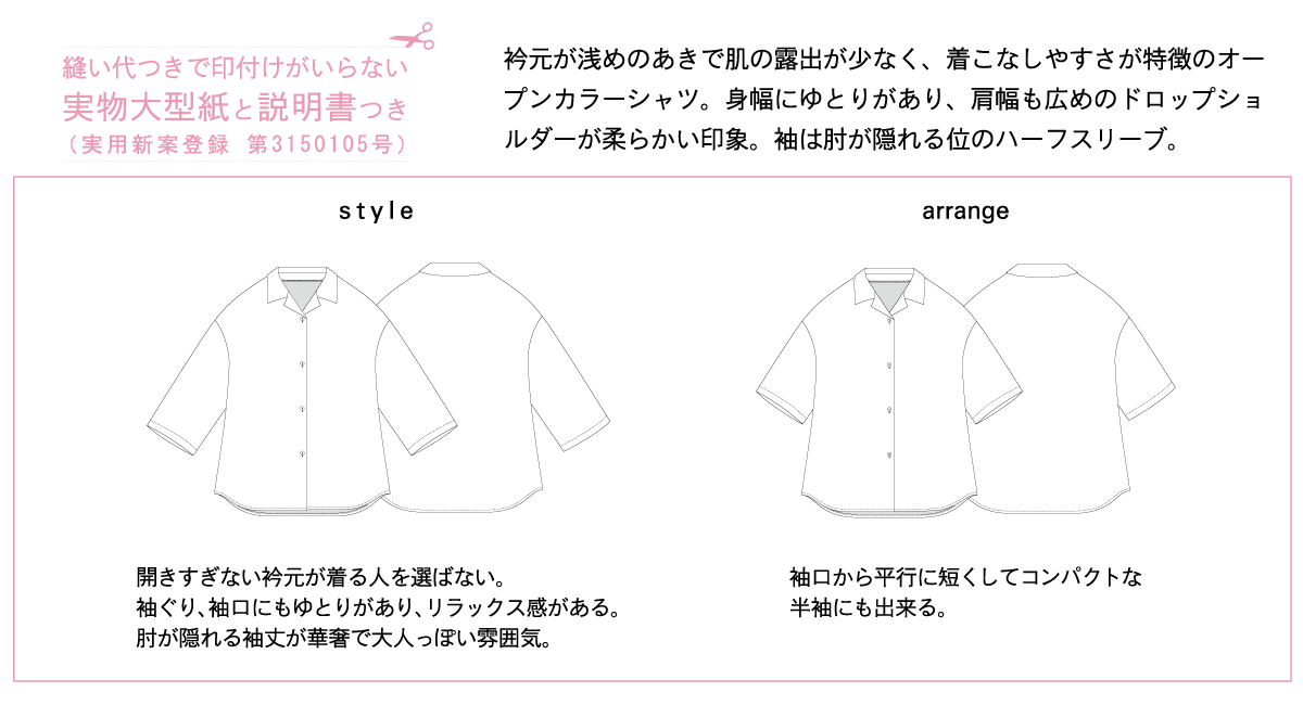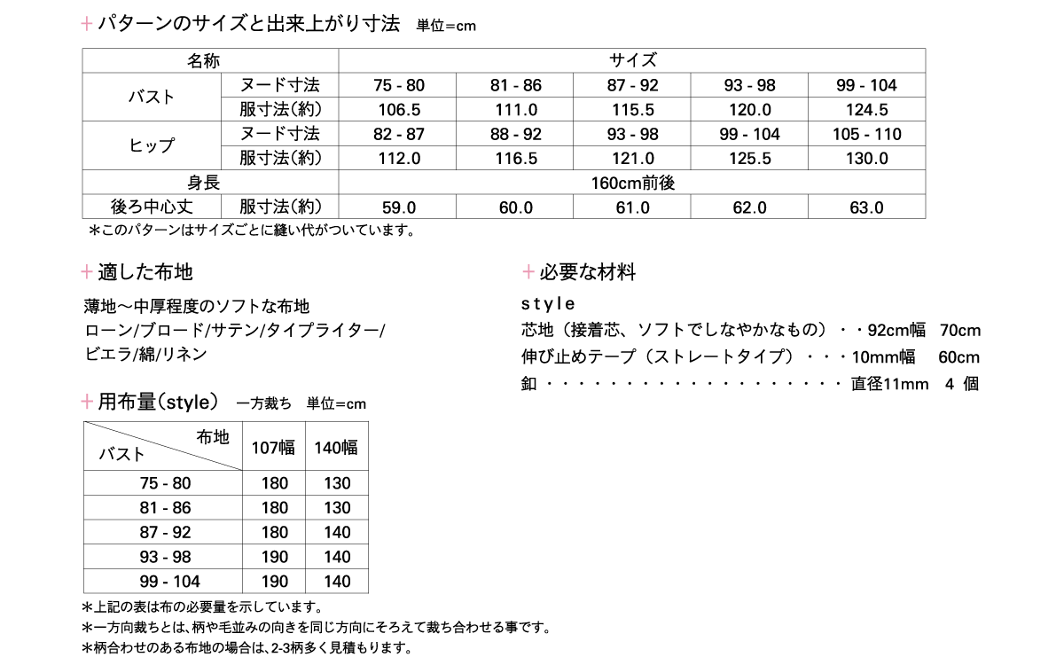 ●この商品は、ネット販売しておりますパターンと違い、1~3枚の紙に複数のサイズが印刷された実物大のパターンです。お客様ご自身でサイズを決定して頂き、、パターンをカットしてご使用下さい。