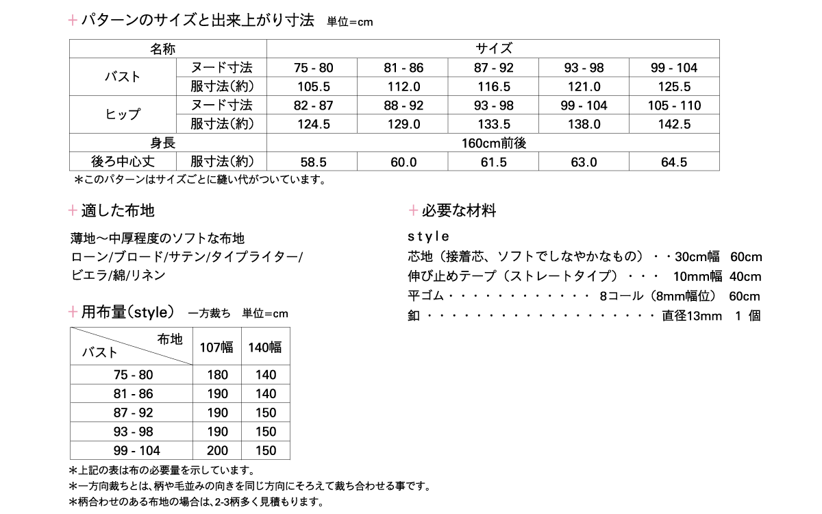 ●この商品は、ネット販売しておりますパターンと違い、1~3枚の紙に複数のサイズが印刷された実物大のパターンです。お客様ご自身でサイズを決定して頂き、、パターンをカットしてご使用下さい。