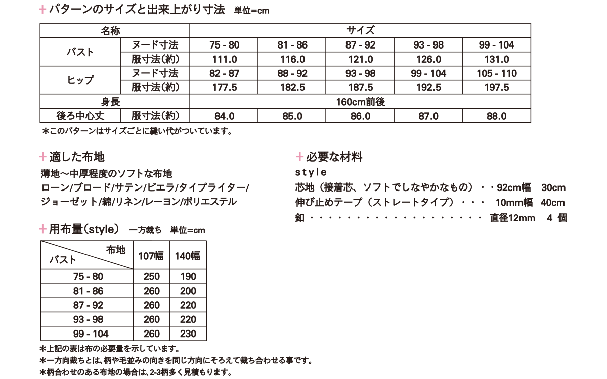 ●この商品は、ネット販売しておりますパターンと違い、1~3枚の紙に複数のサイズが印刷された実物大のパターンです。お客様ご自身でサイズを決定して頂き、、パターンをカットしてご使用下さい。