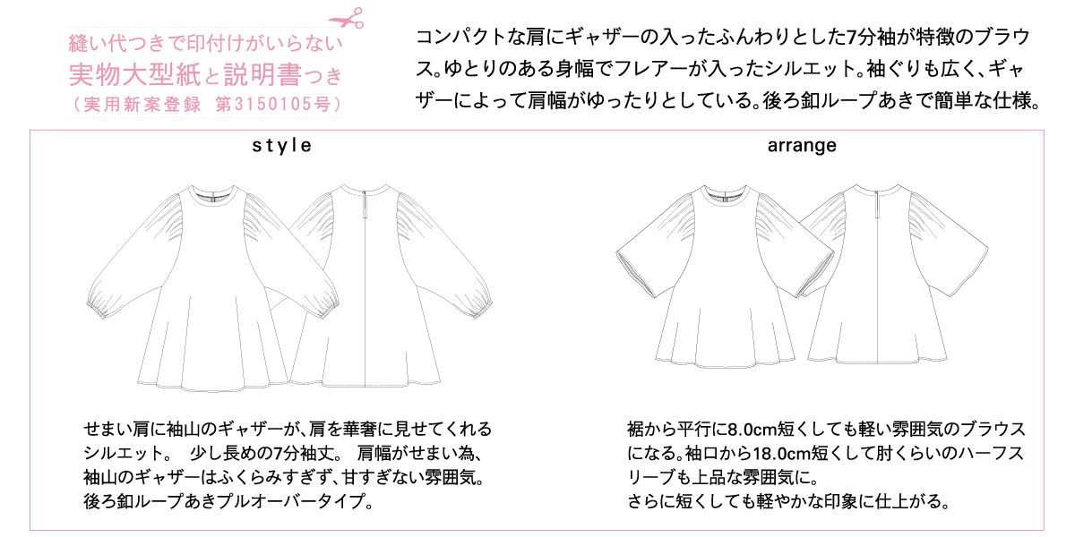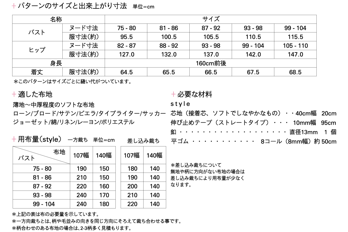 ●この商品は、ネット販売しておりますパターンと違い、1~3枚の紙に複数のサイズが印刷された実物大のパターンです。お客様ご自身でサイズを決定して頂き、、パターンをカットしてご使用下さい。