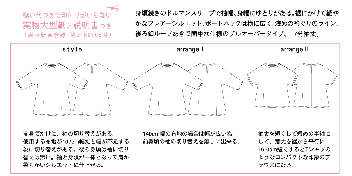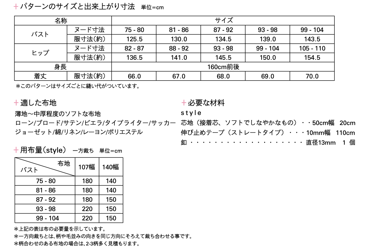 ●この商品は、ネット販売しておりますパターンと違い、1~3枚の紙に複数のサイズが印刷された実物大のパターンです。お客様ご自身でサイズを決定して頂き、、パターンをカットしてご使用下さい。