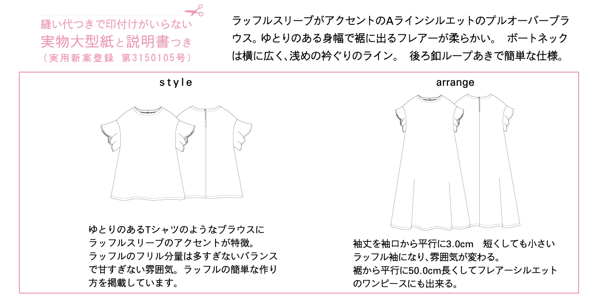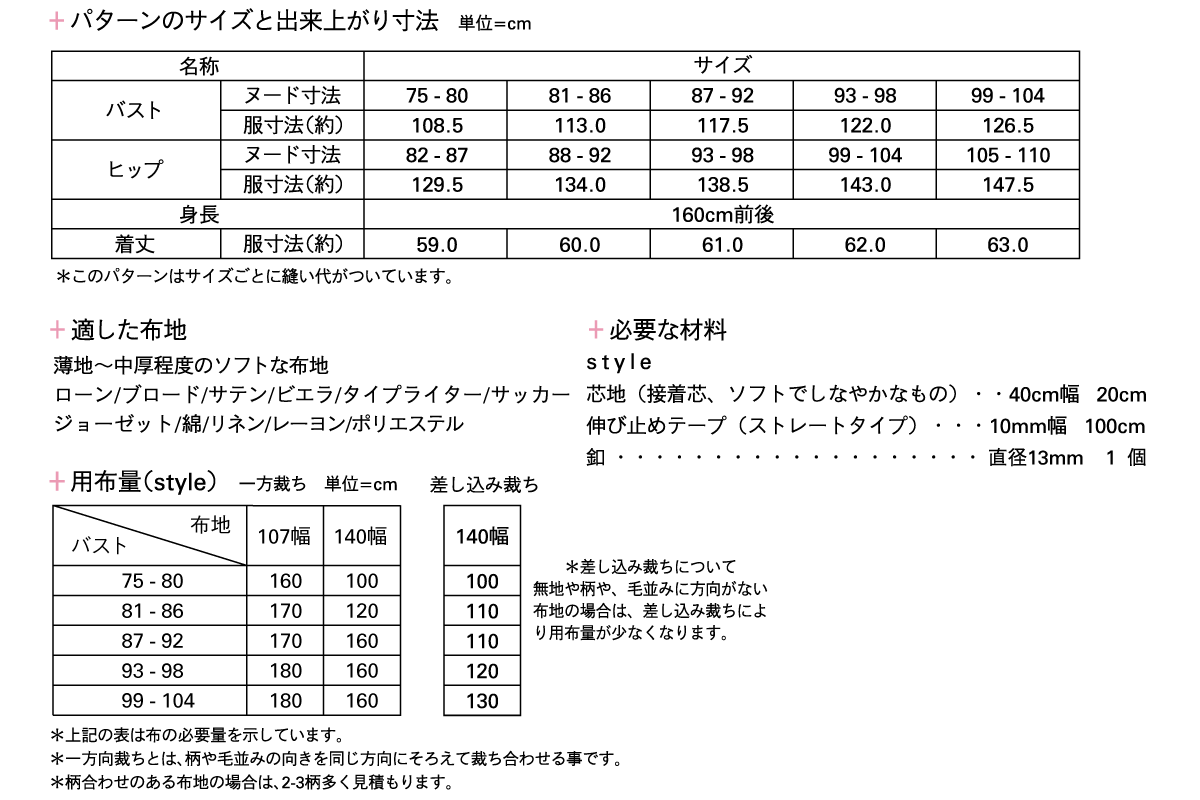 ●この商品は、ネット販売しておりますパターンと違い、1~3枚の紙に複数のサイズが印刷された実物大のパターンです。お客様ご自身でサイズを決定して頂き、、パターンをカットしてご使用下さい。
