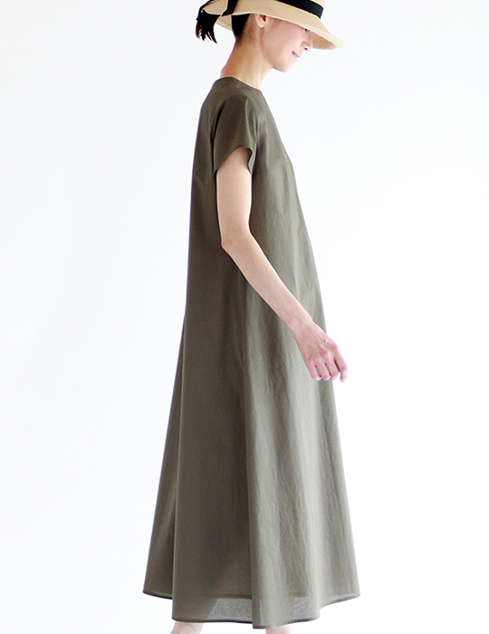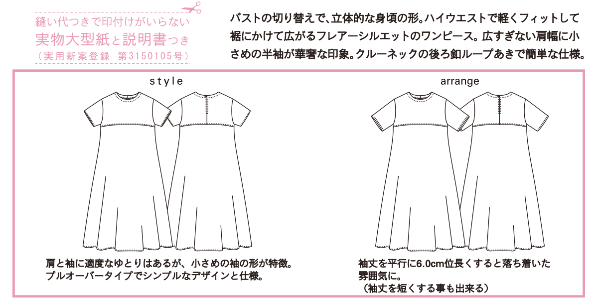 バストの切り替えでダーツを取ってある為、身頃が立体的な形になりハイウエスト位置で軽くフィットし裾に向かって広がるフレアーシルエットのワンピースです。バストの高さを少し出す事によって、身幅が広めでも脇が身体に沿ってすっきりとしたシルエットになるのが特徴です。