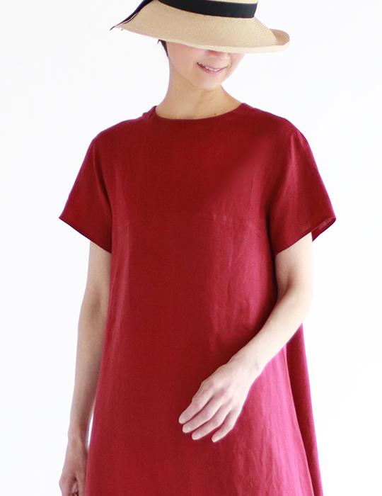 深い赤色の素材は、リネンの平織りで中程度の厚みですが、リネンの平織りの中では少しだけ薄地かもしれません。