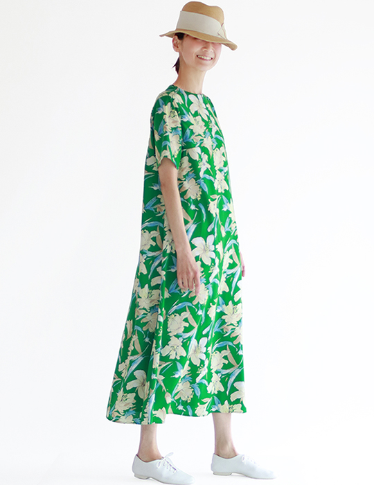 グリーンに少し大きめの花柄のプリント素材は、ポリエステルローンです。