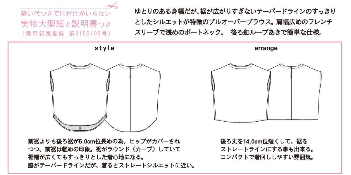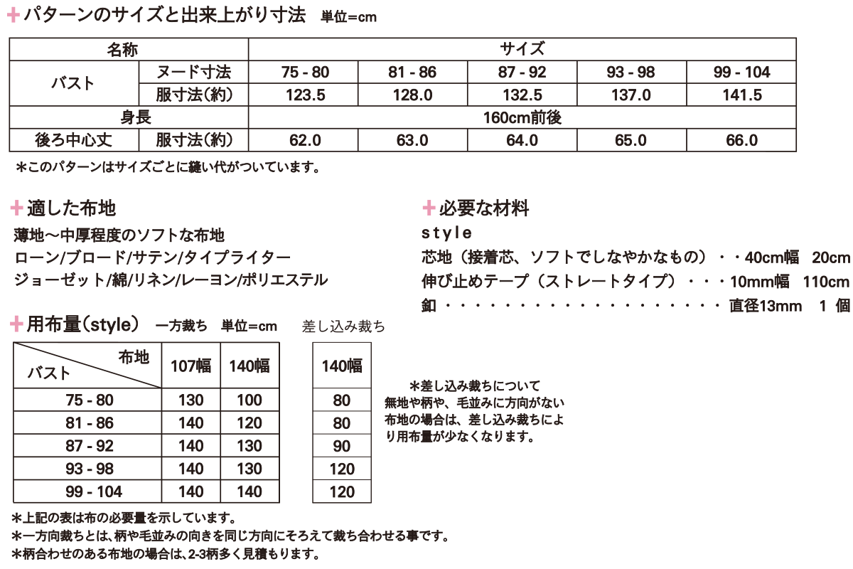 ●この商品は、ネット販売しておりますパターンと違い、1~3枚の紙に複数のサイズが印刷された実物大のパターンです。お客様ご自身でサイズを決定して頂き、、パターンをカットしてご使用下さい。