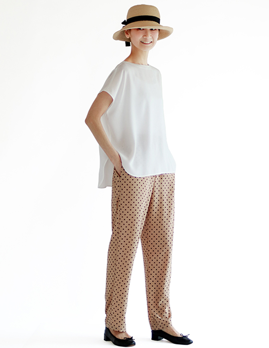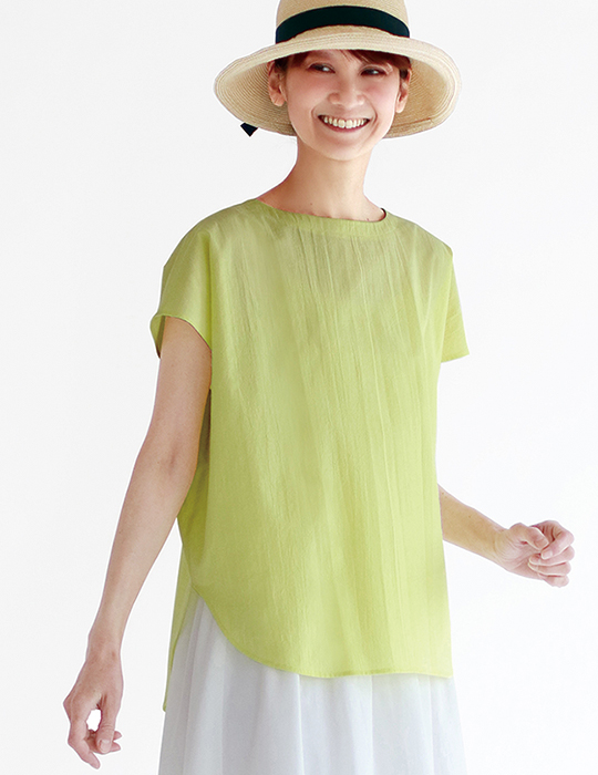 シンプルなデザインなので、ちょっと思い切った色でも意外に着まわしやすいブラウスになり、着こなしのアクセントになるように思いました。