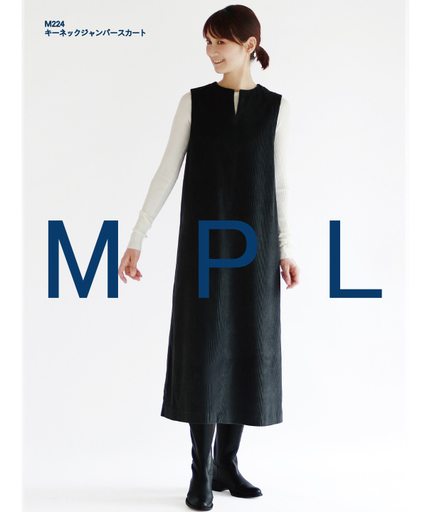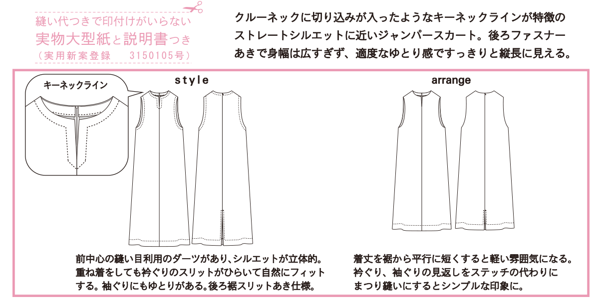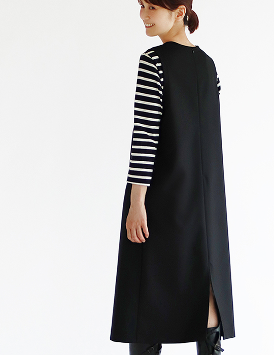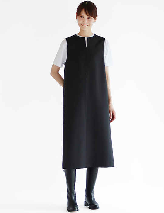 クルーネックに切り込みが入ったような「キーネック」デザインの、ストレートシルエットに近いジャンパースカートです。