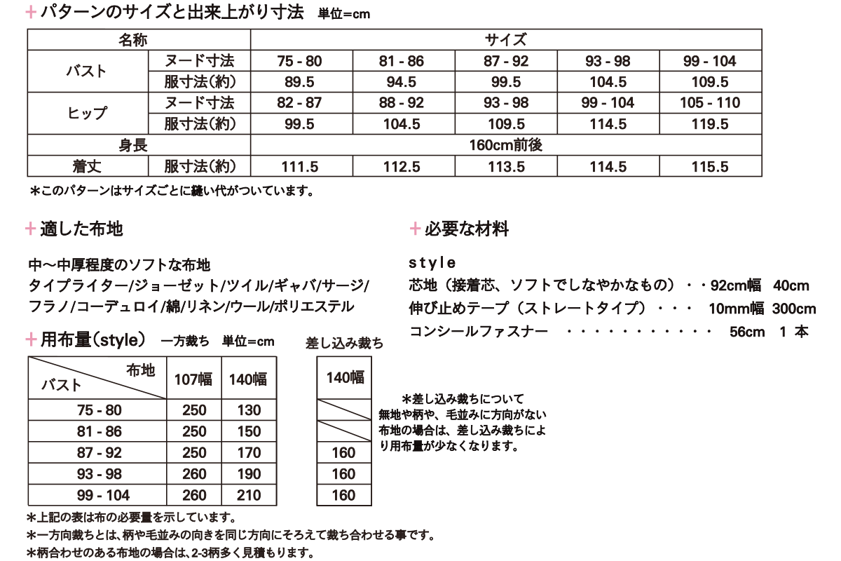 ●この商品は、ネット販売しておりますパターンと違い、1~3枚の紙に複数のサイズが印刷された実物大のパターンです。お客様ご自身でサイズを決定して頂き、、パターンをカットしてご使用下さい。