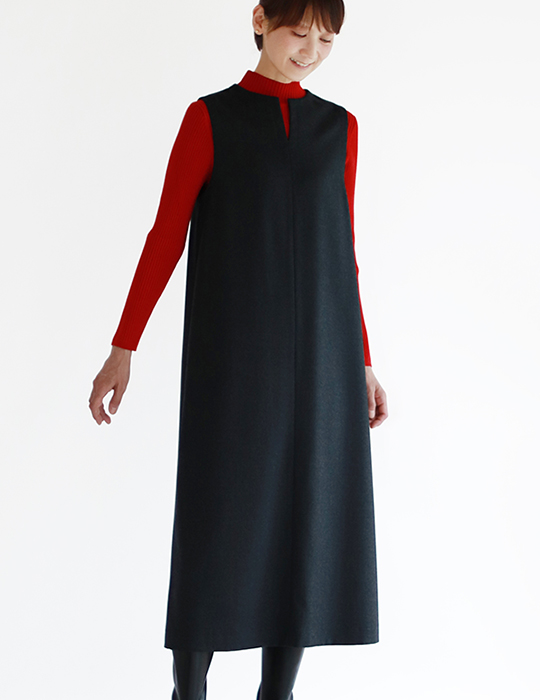 しなやかで落ち感のある素材なのでシルエットも広がり過ぎず、ウールの上品さが感じられるジャンパースカートになりました。