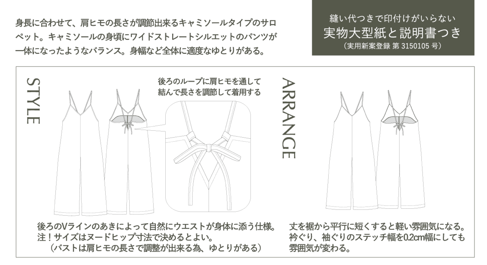 パンツの幅が広めで、裾から丈を短くするなどのアレンジをしても似合うようなラインにしてありますので、自分に合ったバランスでお作り頂けると思います。
