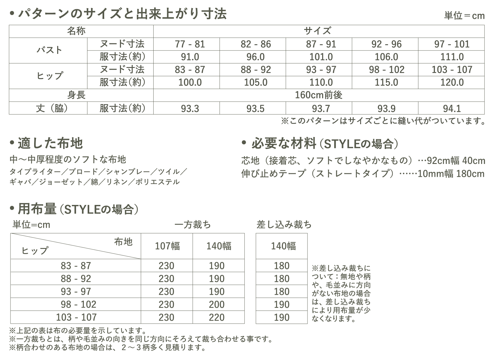●この商品は、ネット販売しておりますパターンと違い、1~3枚の紙に複数のサイズが印刷された実物大のパターンです。お客様ご自身でサイズを決定して頂き、、パターンをカットしてご使用下さい。