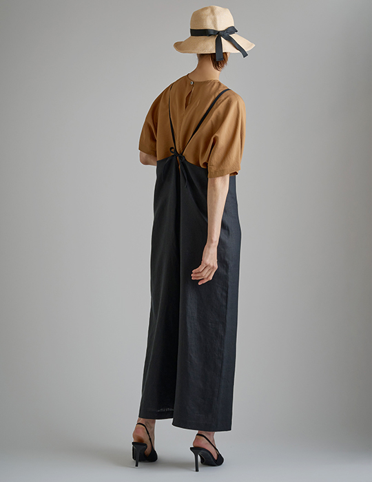 コーディネートはやはりM219「ボートネックドルマンブラウス」を半袖にしたもので、ネックラインの形や袖ぐりがないデザインで、肩のラインが柔らかいことでキャミソールサロペットと相性が良いのかなと思いました。