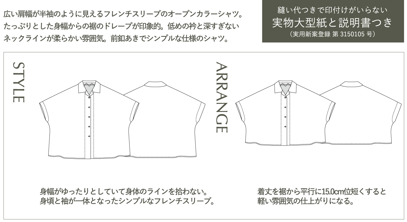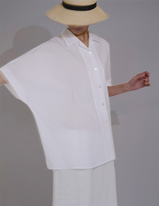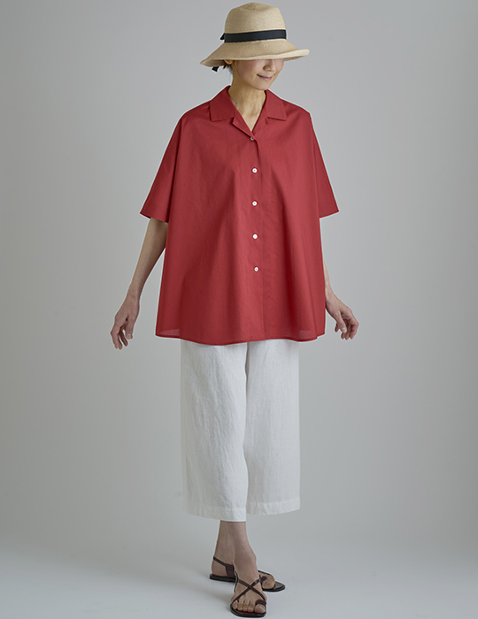 広い肩幅と身幅がポンチョのようなシルエットのオープンカラーシャツです。袖付けがないのでシンプルな仕様です。