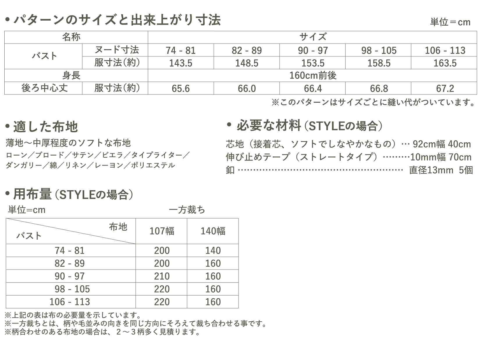 ●この商品は、ネット販売しておりますパターンと違い、1~3枚の紙に複数のサイズが印刷された実物大のパターンです。お客様ご自身でサイズを決定して頂き、、パターンをカットしてご使用下さい。