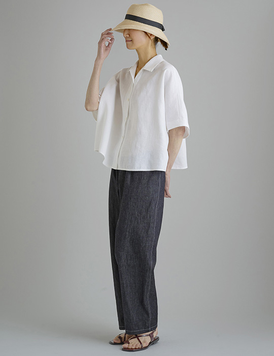 白とレンガ色のタイプライターのシャツとコーディネートしているパンツは参考商品。白のリネンとコーディネートしているパンツは、「P2502イージーワイドテーパードパンツ」です。