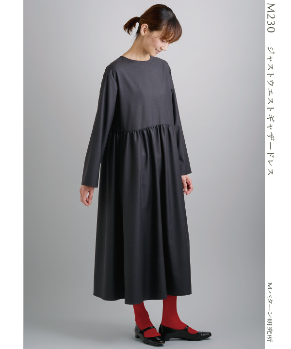 適度なハリと反発感、落ち感があるのでギャザーのうねがはっきりと出てシルエットは広がり過ぎず、身体の動きにしなやかに揺れる上品な秋冬感のあるワンピースに仕上がりました。ナチュラルなイメージのデザインですが、ポリエステルやレーヨンなどの素材の進化は目覚ましく、チャコールグレーに赤い靴下を合わせるとモードを感じます。こうした色や素材の選択で、モードっぽく仕上げるのがお薦めです。