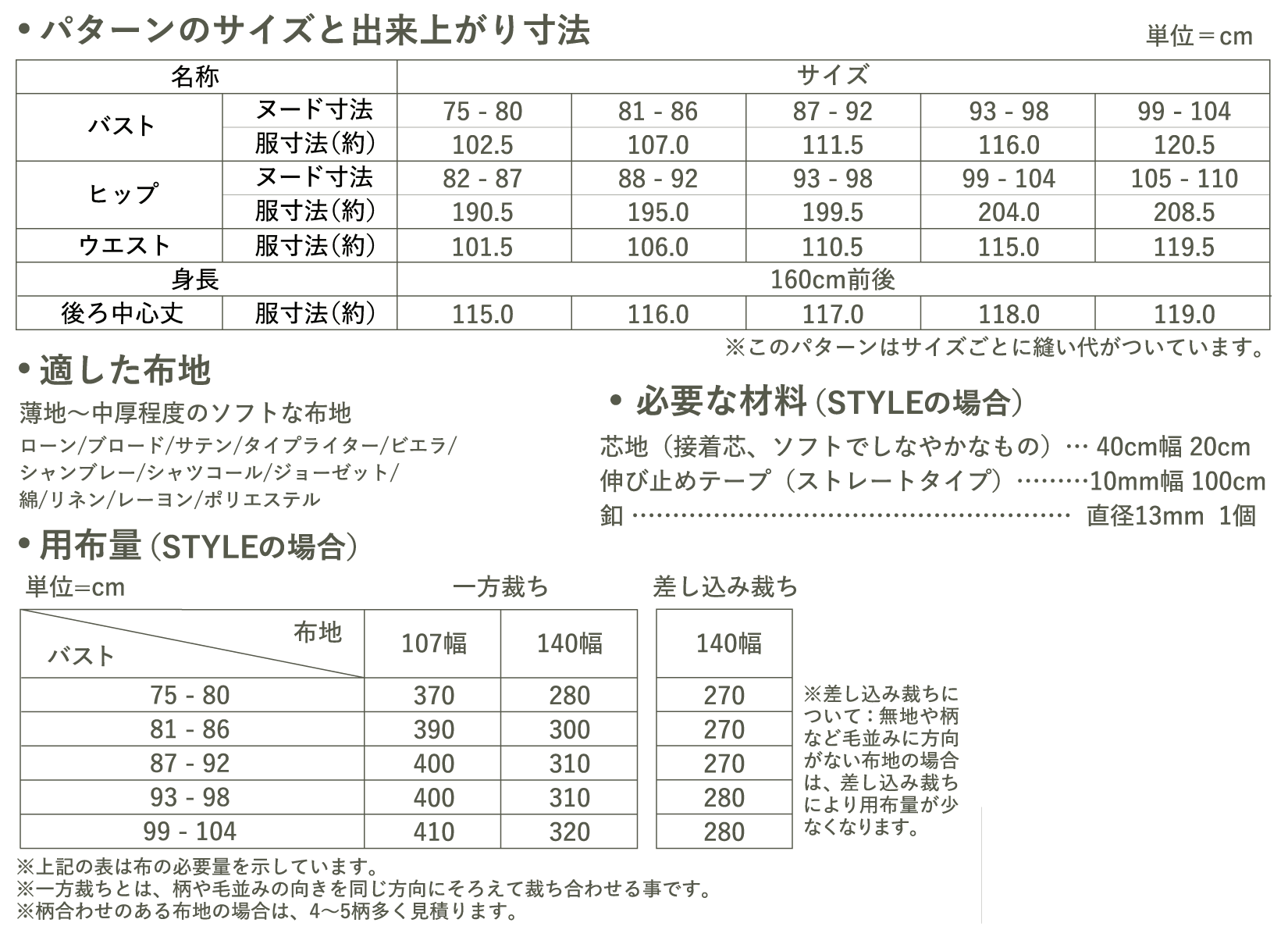 ●この商品は、ネット販売しておりますパターンと違い、1~3枚の紙に複数のサイズが印刷された実物大のパターンです。お客様ご自身でサイズを決定して頂き、、パターンをカットしてご使用下さい。