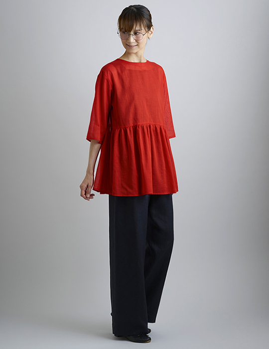 薄手のリネンが肌にさらりと心地良く、鮮やかな赤色が元気になれそうな一着です。