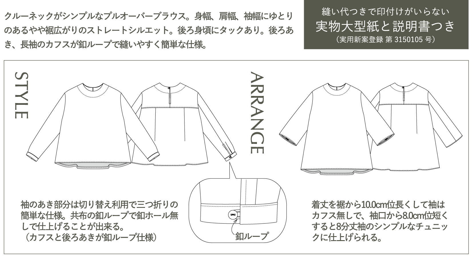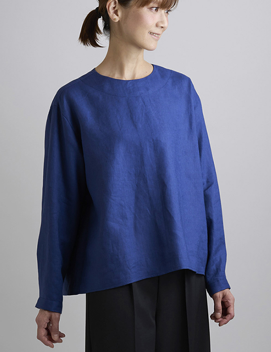 秋~春まで着たくなる、シンプルな長袖Tシャツのようなイメージです。シンプルで定番のデザインながら、1枚あると色々な着こなしが出来、長い期間着れてきちんと感もある、そんなブラウスに仕上げられたと思います。
