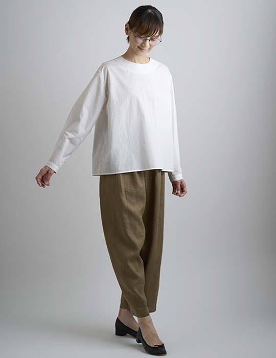 衿ぐりの大きさや肩幅なども、パンツやスカートと合わせてしっくりくるバランスにしてあります。