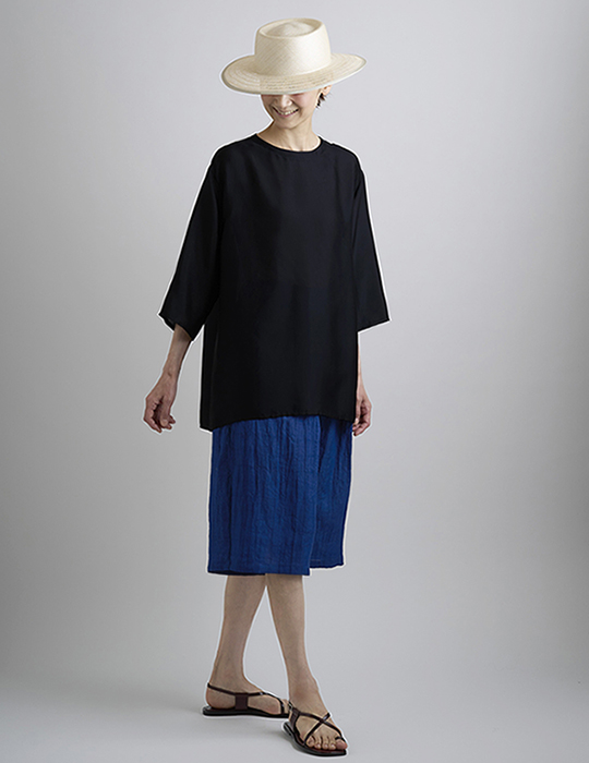 黒の素材はレーヨンのローンです。薄手ですが適度なハリと反発感があるので、身体から離れたしなやかなシルエットに仕上がりました。